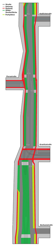 Alle Radwege sollen auf Bürgesteigshöhe gelegt werden, damit es nicht zu Konflikten mit Gleisen kommen kann. Einzige Ausnahme ist der Haltestellenbereich des Busses südlich der Granitzstraße.
