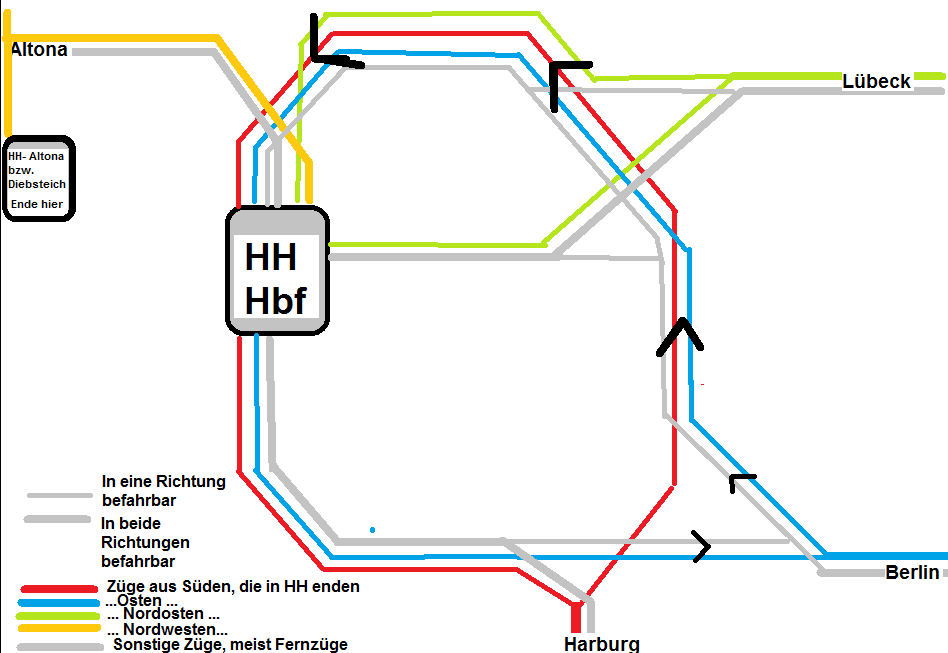 Und selbst wenn nicht alle deiner Züge aus Süden am neuen Bahnhof halten, sind ein Gleis pro Richtung aus Harburg stark unterdimensioniert.