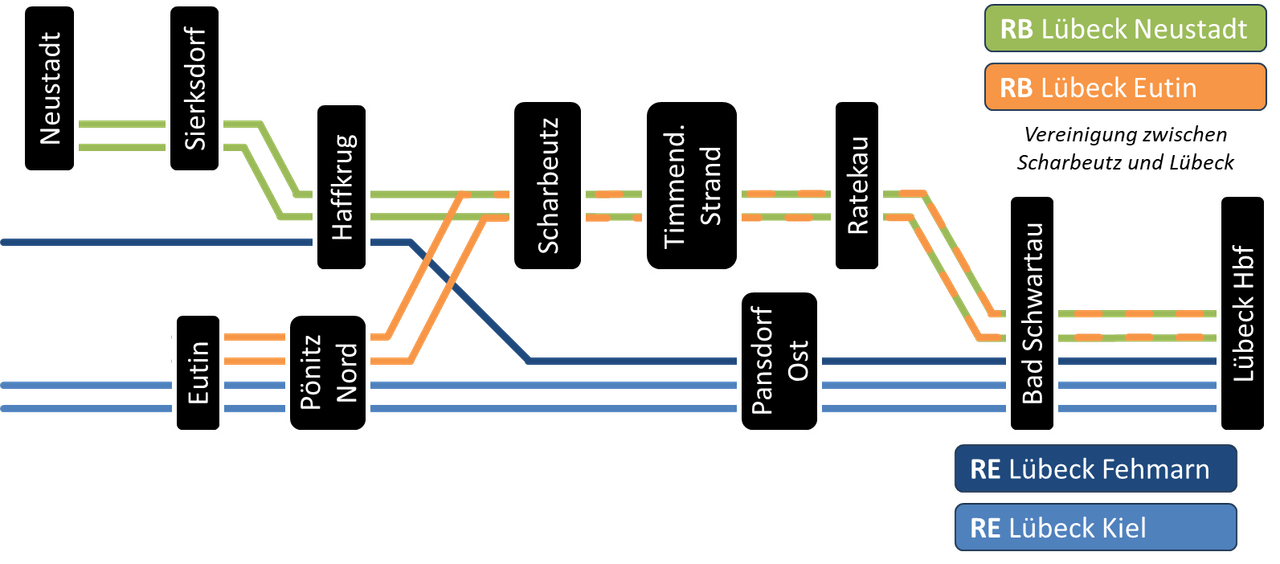 Anstatt die Bahnstrecke entlang der Ostseebäder stillzulegen, wird die Bahnstrecke im „Hinterland“ zwischen Pönitz und Bad Schwartau stillgelegt und nördlich von Pönitz die Strecke Kiel – Lübeck zum einen an die Neubaustrecke als auch an die bestehende Bäderbahn angebunden. An der Strecke wird ein neuer Halt in Pönitz Nord eingerichtet, außerdem bekommt Panitz einen zusätzlichen, (leider) ortsfernen Halt an der Neubaustrecke (mit Busanbindung).